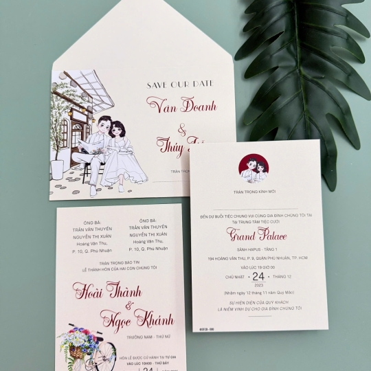 Mẫu thiệp cưới với chi phí chỉ từ 3.000đ họa tiết chibi xinh xắn, đa dạng thiết kế tinh tế trên chất liệu GIẤY ÁNH KIM thơm nhẹ sang chảnh.